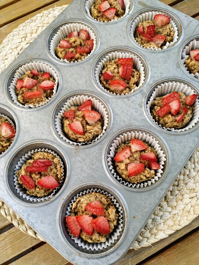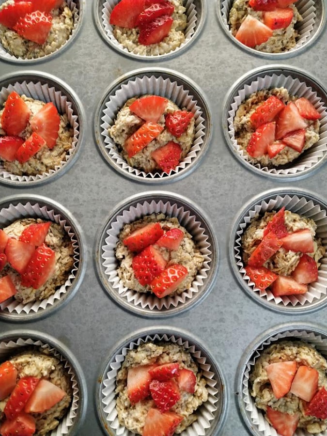 Lavamos las fresas y las trocemos, repartimos por encima de nuestros muffins.