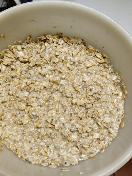 En un bol mezclamos los copos de avena con las semillas de chía, ponemos la bebida vegetal y movemos, derretimos el aceite de coco y lo agregamos junto con el resto de ingredientes menos las fresas.