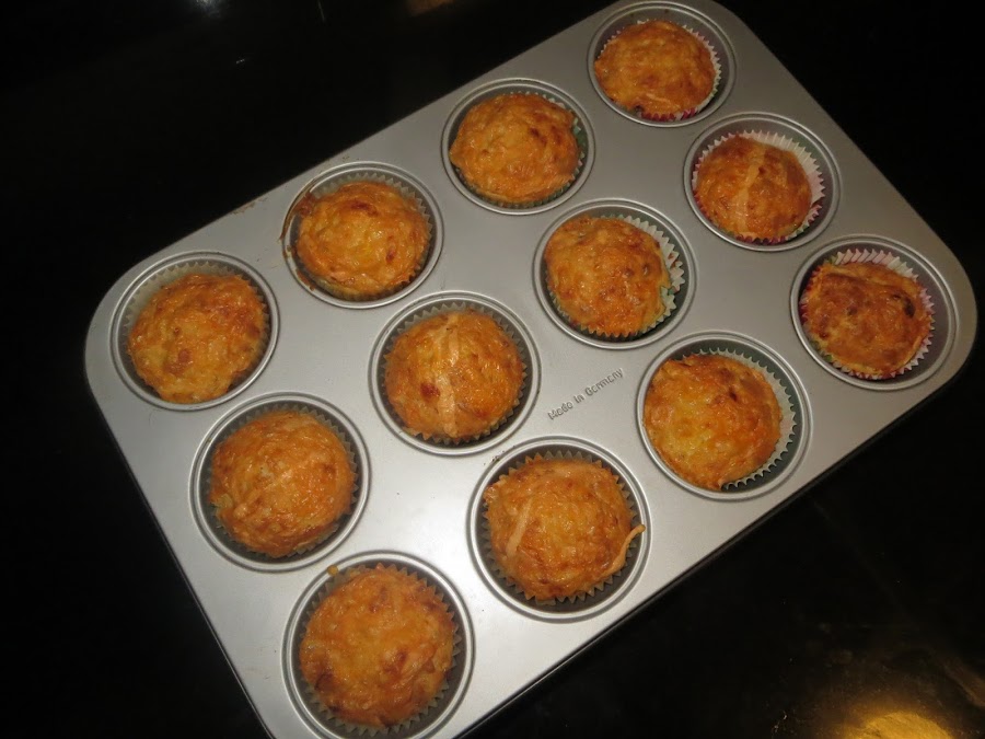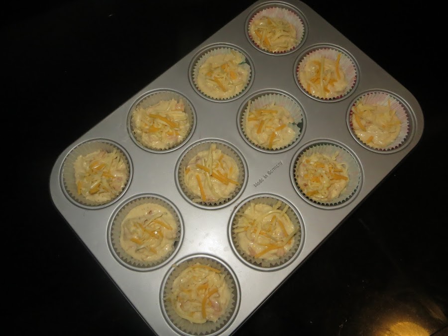 Por otro lado, mezclamos la mantequilla derretida, los huevos y la leche. Mezclamos ambos ingredientes y rellenamos las cápsulas hasta ¾ de su capacidad. Echamos un poco de queso rallado cuatro quesos por encima de cada muffins. Los dejamos durante 25 minutos o hasta que estén dorados y ya están listos para servir.