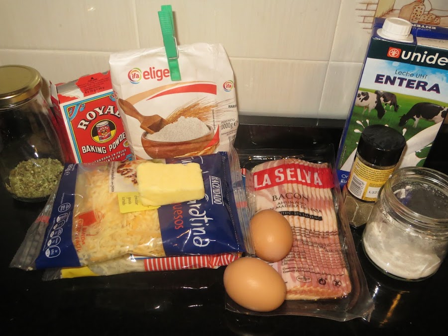 Precalentamos el horno a 190º. Freímos bacon en una sartén hasta que esté crujiente y troceamos. Mezclamos los ingredientes secos: la harina tamizada, el queso rallado, levadura, sal, pimienta y orégano.