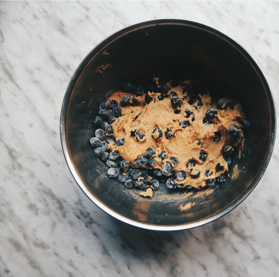Agregamos las blueberries a la mezcla e integramos con una espátula.