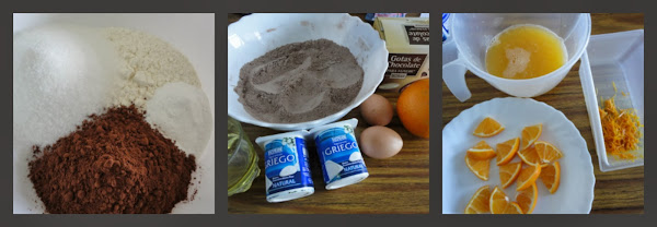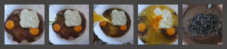 Mezclamos harina, cacao y levadura con cuidado de deshacer todas las bolitas que se puedan formar. A continuación, añadimos los yogures, el zumo, la piel rallada, la leche, el aceite y los huevos y, mezclamos bien hasta obtener una mezcla homogénea y sin grumos. Por último, agregamos las pepitas de chocolate y las integramos con el resto de la masa sin batir en exceso.