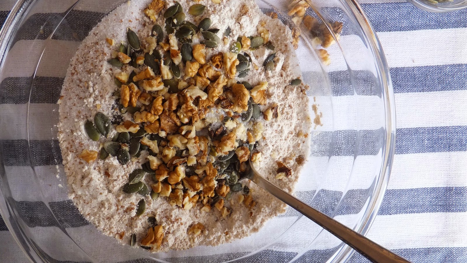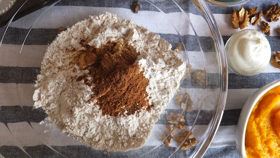 6. Tamiza la harina, la sal, las especias, el bicarbonato y la levadura. Echa todo a un bol grande y añade el azúcar y las nueces. Mezcla bien hasta que queden bien distribuidos.