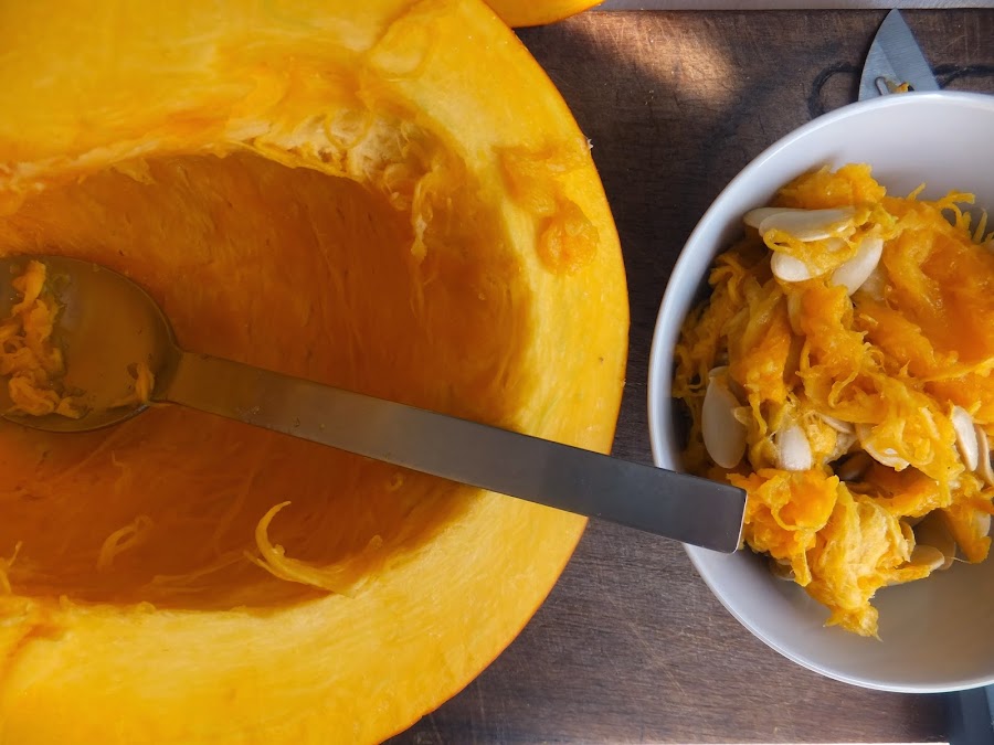 1. Prepara el puré de calabaza. Limpia y corta la calabaza por la mitad o en trozos grandes. Desecha las pepitas y las hebras.