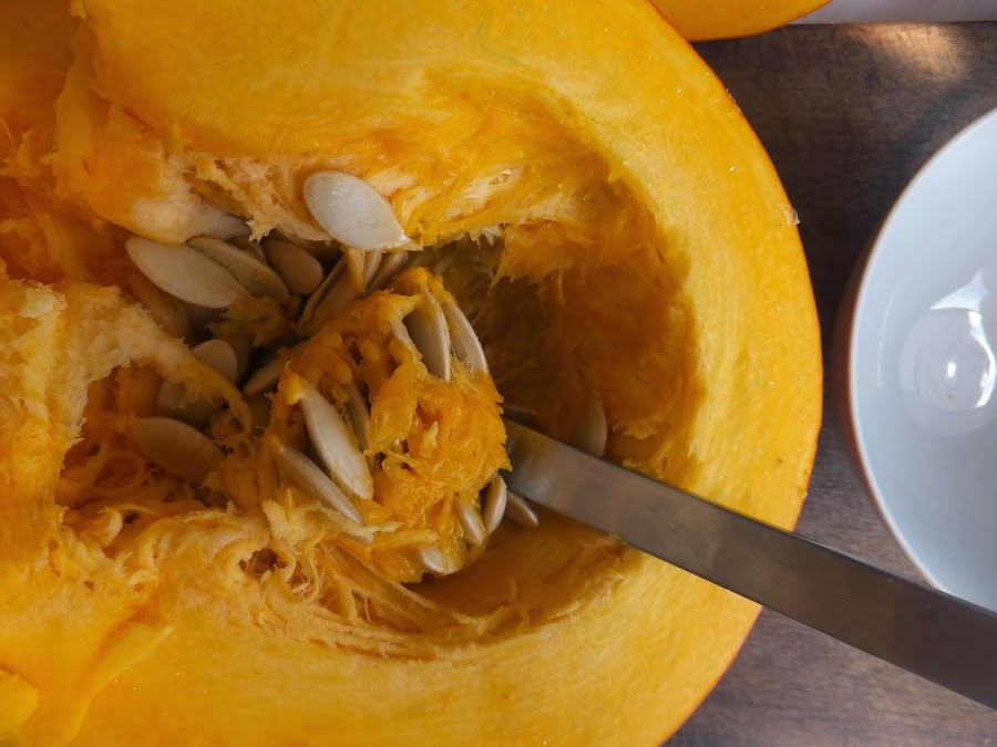 Dos eran vascas, nacidas en mi pueblo, alargadas, pesadas verdes por fuera y naranja fosforescente por dentro. Riquísimas en puré y asadas. La tercera era una de una variedad difícil de encontrar en los comercios locales, la calabaza en la que uno piensa cuando piensa en la calabaza, la de halloween, la de Zipi y Zape, la del 1,2,3... Esa calabaza, esta calabaza: