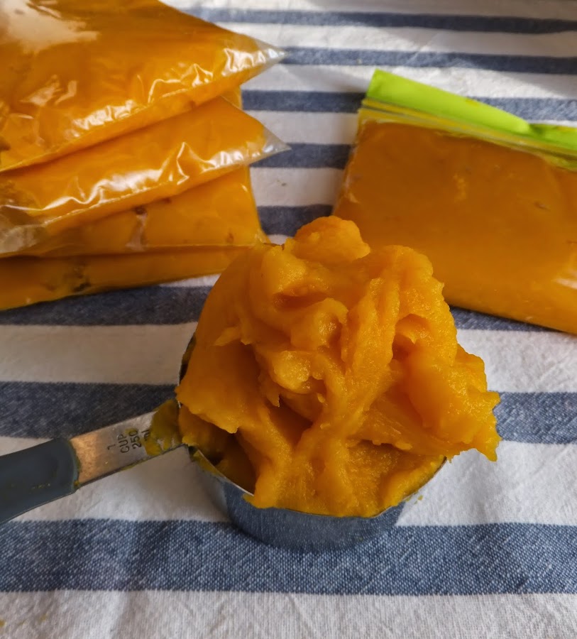 4. Bate el puré con una batidora o procesador de alimentos (opcional) y separa 400 gr para hacer los muffins. (Yo suelo congelar el puré restante en bolsas individuales de ración para disponer de ellas cuando quiera. Se conservan bien hasta un año. Otra opción es comerselo tal cual, en tortitas...)