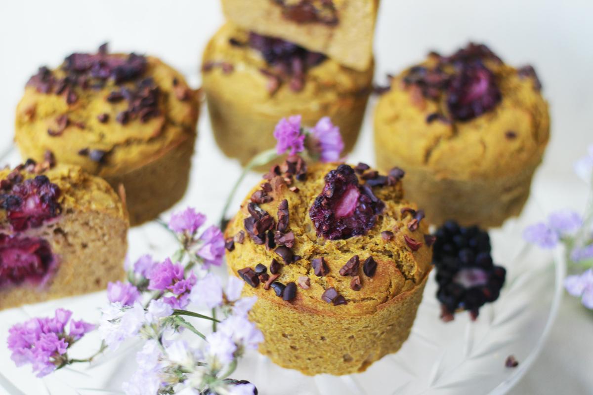 En moldes de silicona de muffins añadimos una cucharada, ponemos en el centro una mora o un trozo de chocolate y cubrimos con otra cucharada de masa. Podemos hacer 3 rellenos de moras y 3 rellenos de chocolate o al gusto. Por encima decoramos con nibs de cacao y moras partidas a la mitad.
