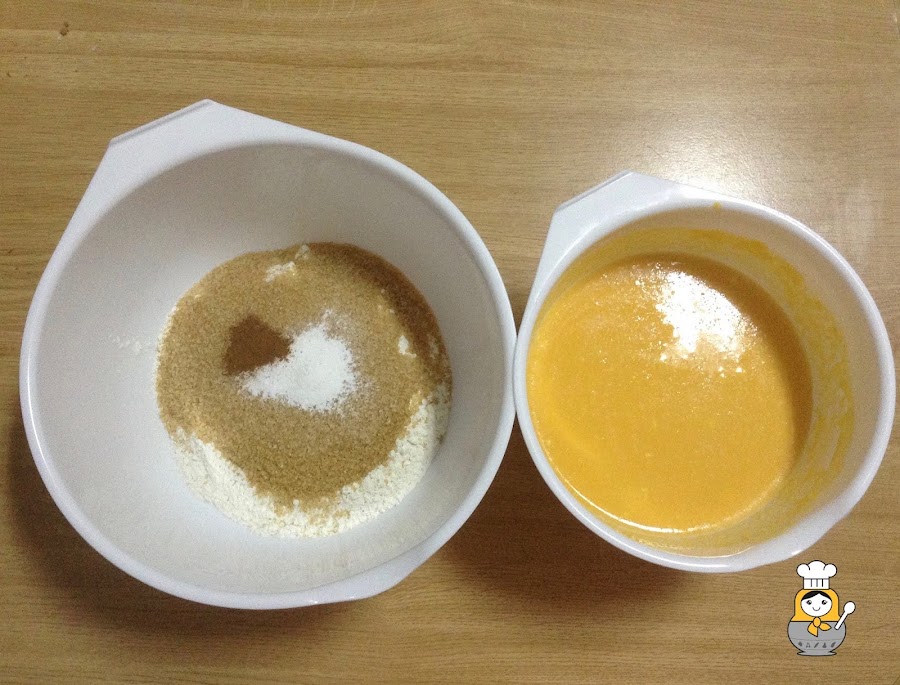 En otro bol más pequeño mezclamos bien la harina tamizada, el azúcar, el bicarbonato, la levadura y, si os apetece, también la canela.