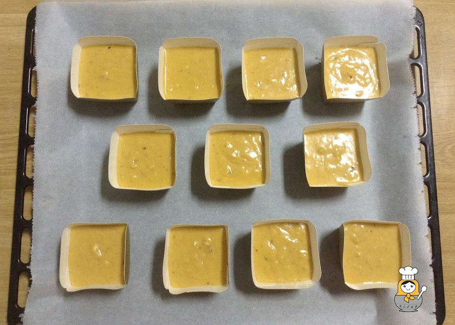 Por último, en una bandeja de horno, colocamos los moldes para magdalenas y vertemos la masa dentro con cuidado de no llenarlos hasta el borde ya que crecerán durante la cocción.