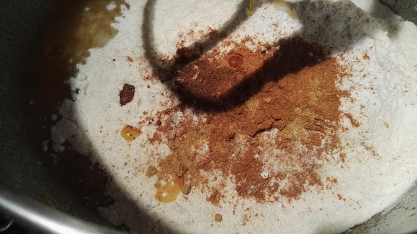 Luego agregamos y mezclamos los ingredientes secos: harina, bicarbonato, levadura, sal, canela, nuez moscada y jengibre.