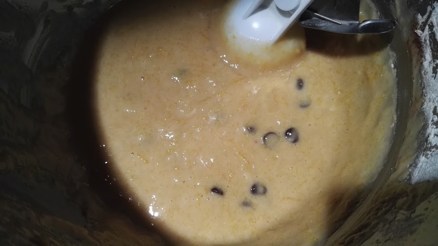 Agregamos las chispas de chocolate pasadas por un poco de harina para que no se vayan al fondo.