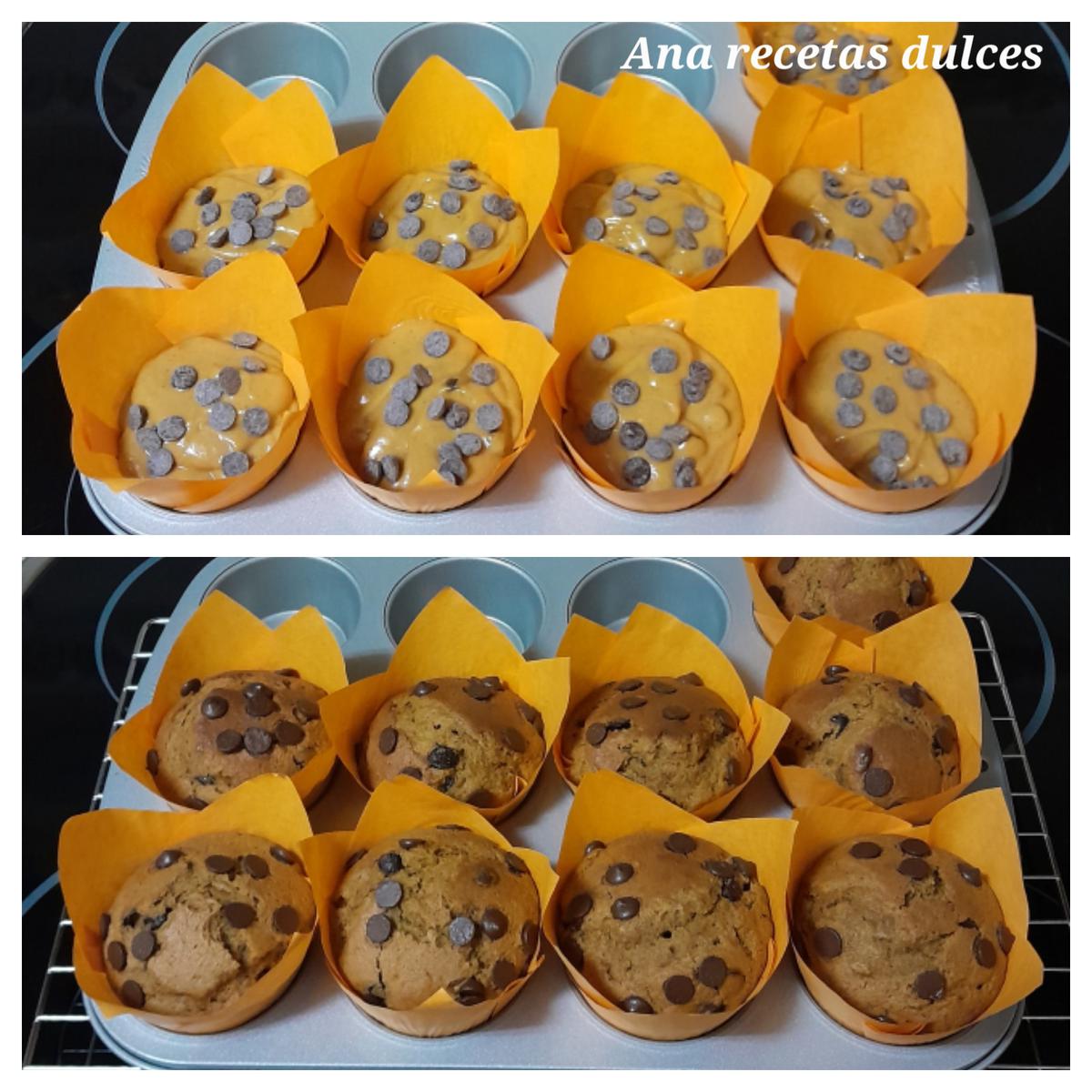 Ponemos las cápsulas para muffins en el molde y rellenamos un poco más de la mitad, repartimos por encima las pepitas de chocolate.