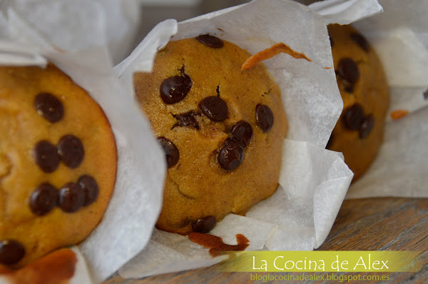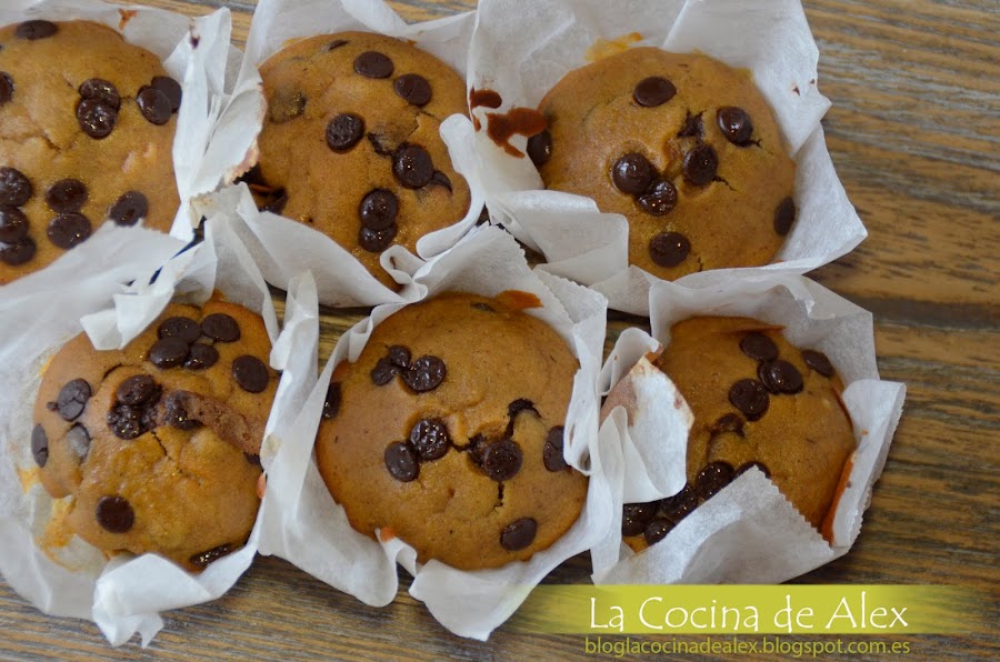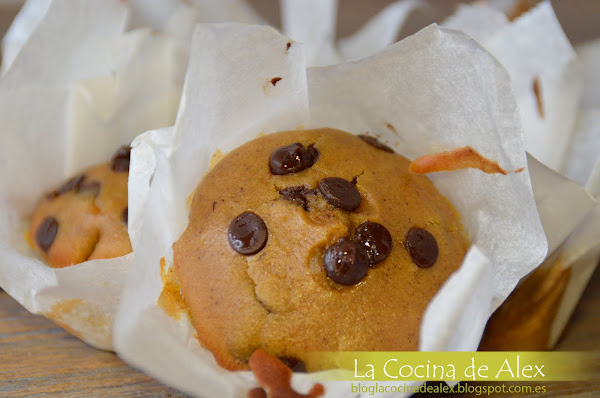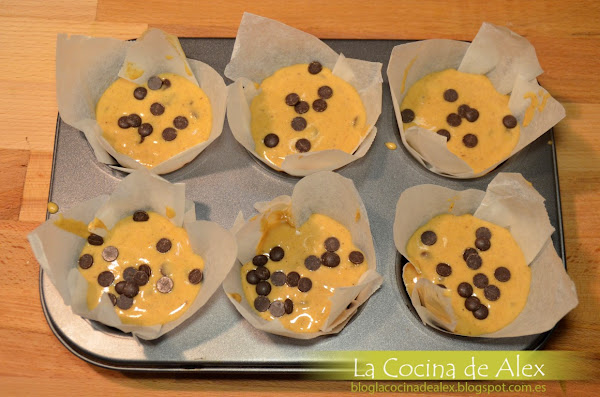Por último solo tenemos que rellenar nuestros papeles de muffins o de magdalenas con la mezcla hasta 3/4 del total, espolvorear por encima con las pepitas de chocolate que habíamos reservado en el paso anterior y hornear a 180ºC durante 25-30 minutos.