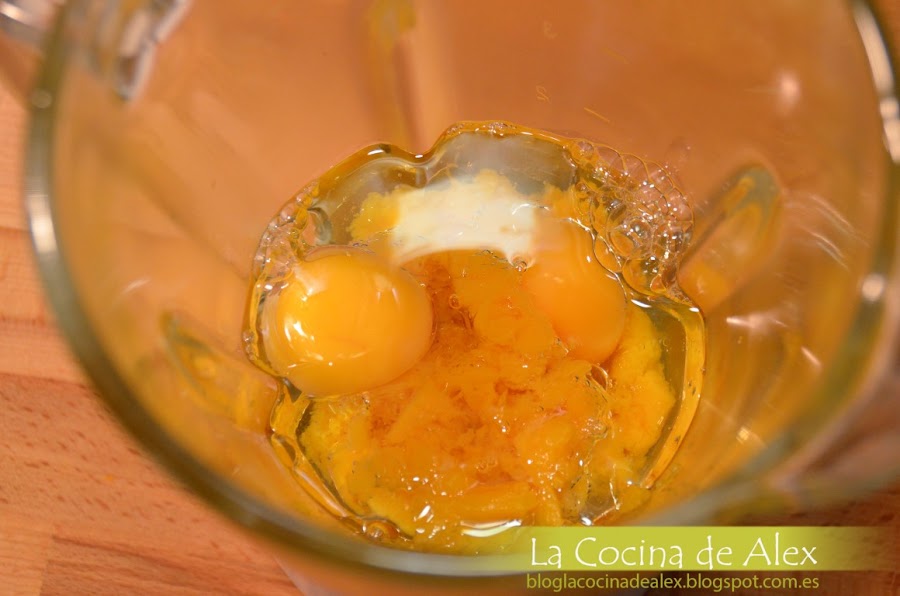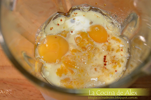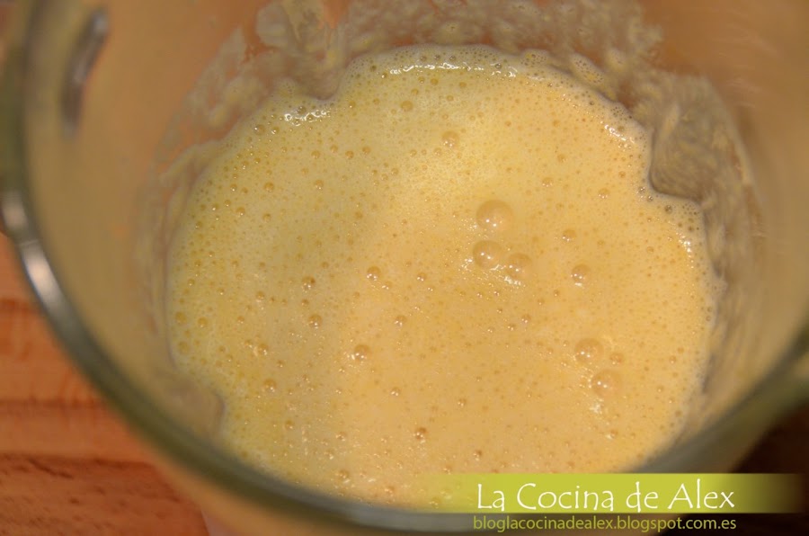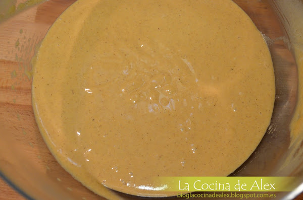 Metemos la calabaza cocida en un vaso batidor para obtener un puré, que vamos a batir con los huevos, el aceite, la leche, el azucar y el extracto de vainilla. Reservamos.