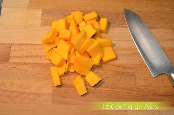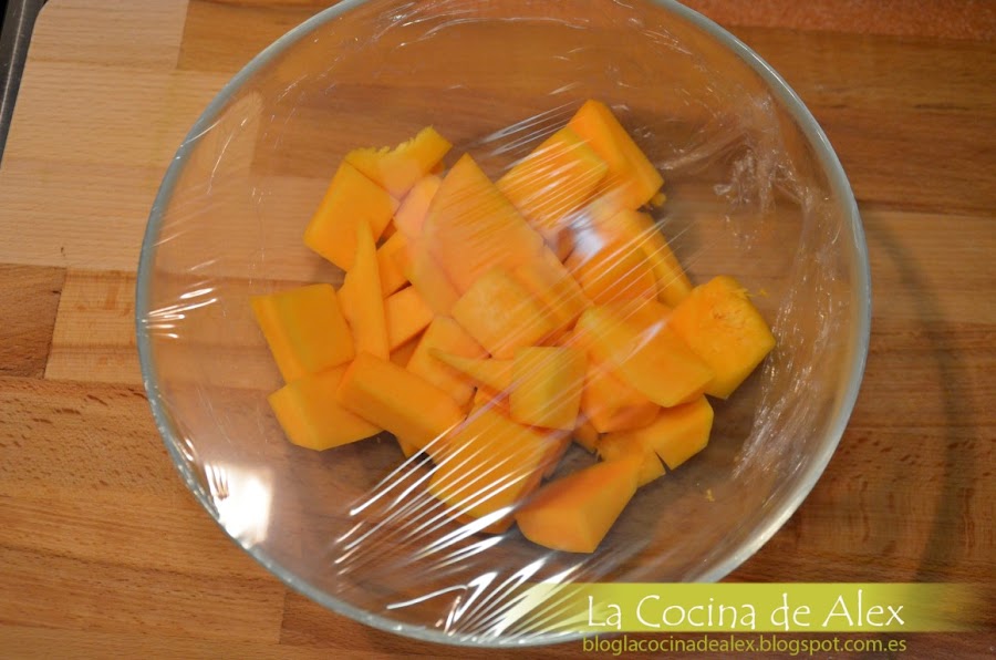 Precalentamos el horno a 180ºC. Para hacer la masa de los muffins, lo primero que necesitamos es la calabaza asada, yo en esta ocasión en vez de encender el horno y espera el tiempo que tarda en asarse, he pelado y troceado la calabaza, la he puesto en un bol tapado con film transparente y la he cocido en el microondas durante 7-8 minutos a máxima temperatura o hasta que la calabaza este tierna.