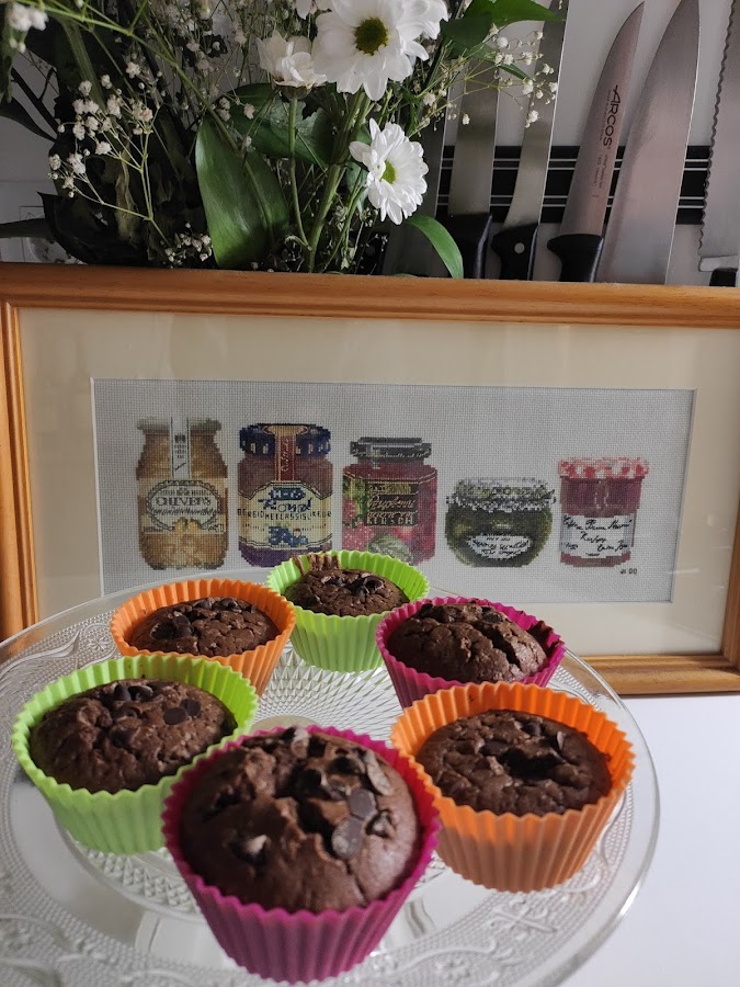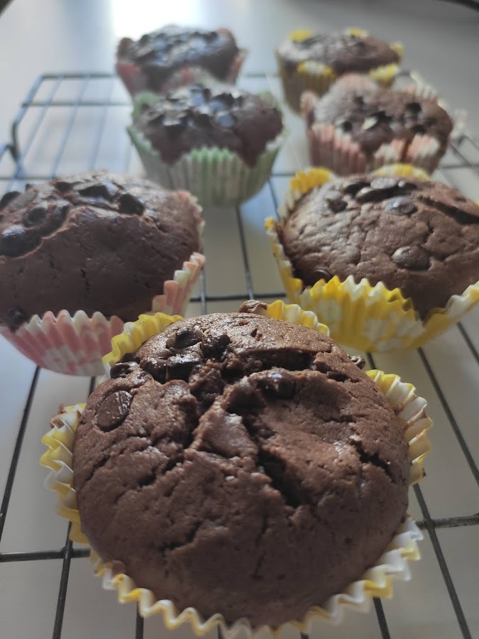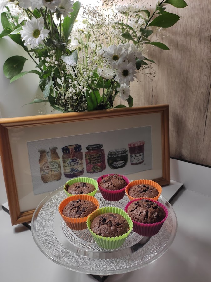 Cambiamos la varilla de globo por la plana e incorporamos los ingredientes secos que teníamos mezclados y reservados. Empezamos a batir a una velocidad baja y los vamos incorporando poco a poco. Una vez que tengamos una masa homogénea incorporamos los chips de chocolate. La cantidad al gusto de cada cual. Mezclamos y ya estará listo para repartir en los moldes. Saldrán unos 10 aproximadamente. Rellenamos los moldes y echamos unos pocos chips por encima y metemos al horno que estará precalentado a 180º con calor arriba y abajo. Dejamos 30 minutos. Sacamos del horno dejamos reposar unos 5 minutos. Ahora ya podemos pasarlos a una rejilla.
