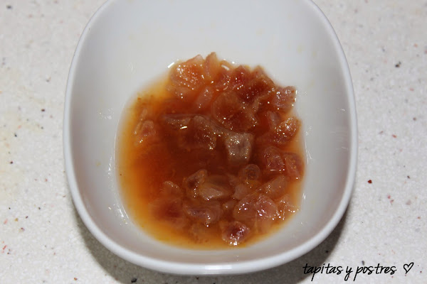 Lo primero es hidratar la fruta, La picamos en trocitos y la ponemos en un bol con zumo de naranja. Este paso es opcional, yo he querido probar a ver cómo salen.