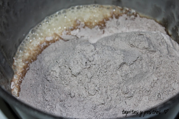 Tamizamos los elementos secos, harina, cacao, azúcar y levadura. Reservamos.