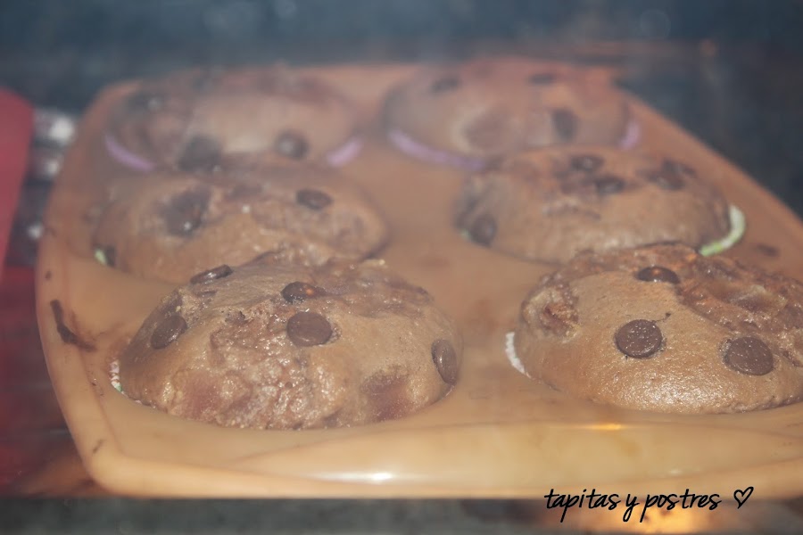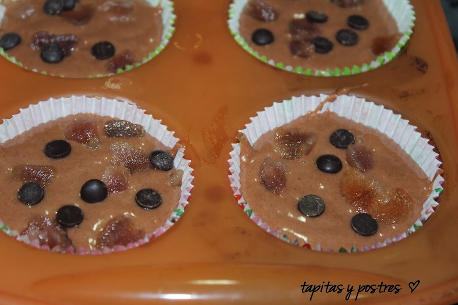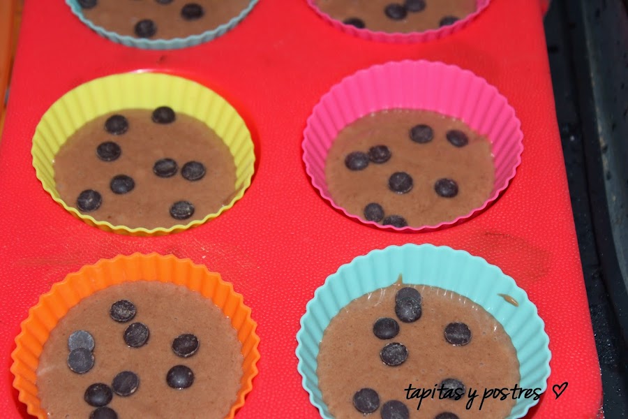 Las ponemos en cápsulas de magdalenas y las colocamos en un molde de silicona, así no se nos abrirán. Decoramos con los chips de chocolate.