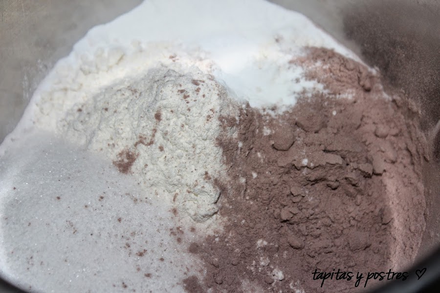 Ponemos en el vaso de la thermomix la harina, el cacao, el azúcar y la levadura. Seleccionamos 10 segundos, velocidad 6. Reservamos.