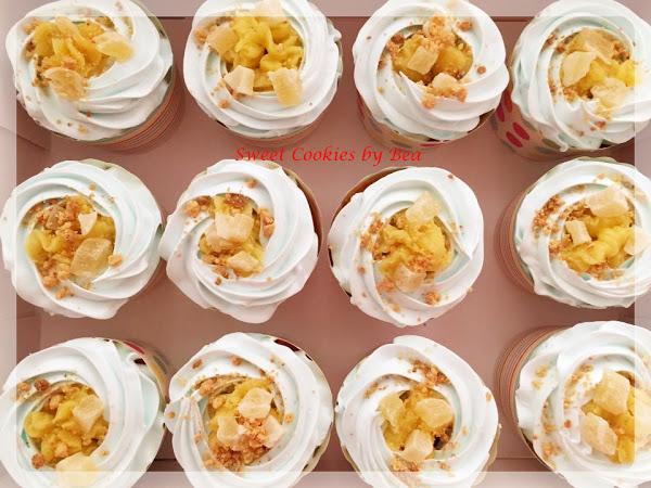 Estos unos cupcakes de piña cubiertos de merengue italiano y lima curd con unos trocitos de piña deshidratada.