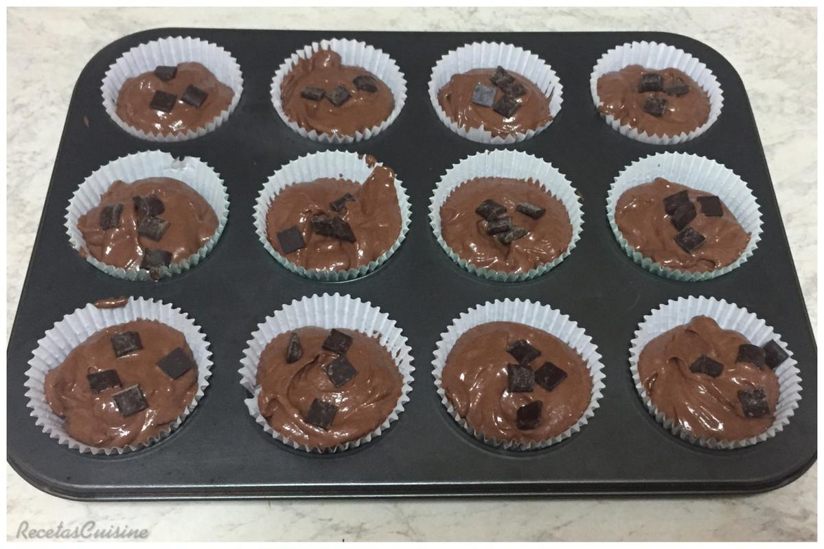 4. Colocamos las capsulas para magdalenas en el molde, y repartimos la mezcla, hasta casi llenar las capsulas. Colocamos encima unas pepitas de las que hemos reservado y cocemos durante 20 minutos aprox. en el horno que tendremos precalentado a 180º.