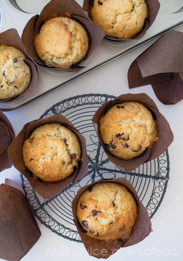 Estos muffins son muy cremosos, porque además de créme frâiche llevan queso cremoso, y por supuesto algo que no puede faltar, chocolate, concretamente una pepitas de chocolate negro que le van de miedo. Y es que cuando la tienda online Santa Grata me hizo llegar estas pepitas de chocolate junto con otros productos que ya os iré enseñando, me fui directa a elaborar esta receta.