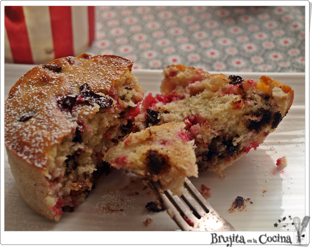 Hoy os propongo unos muffins muy ricos, coloridos, con fruta y chocolate, la idea es de Montes que tiene unas recetas y una fotos increíbles, la sigo desde hace mucho y el año pasado pude conocerle en persona, un encanto y además tenemos familia de la misma tierruca.