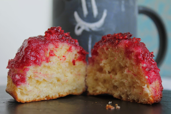 5. Con una cuchara distribuimos la salsa de frambuesa en la base del molde. En mi caso, he puesto dos cucharaditas, eso va en gustos. A continuación con una cuchara de helado distribuir la masa. Hornear a 180ºC durante 20 minutos. Pasado ese tiempo dejar reposar el molde sobre una rejilla metálica durante 10 minutos, y a continuación, desmoldamos volcando el molde sobre la rejilla.