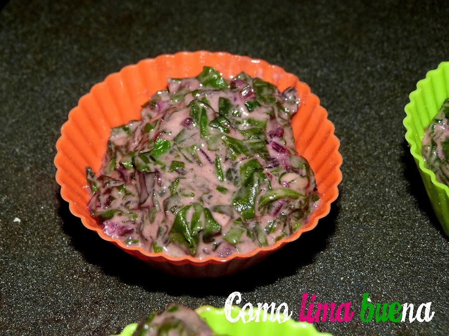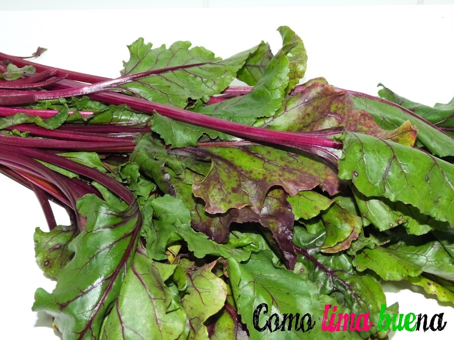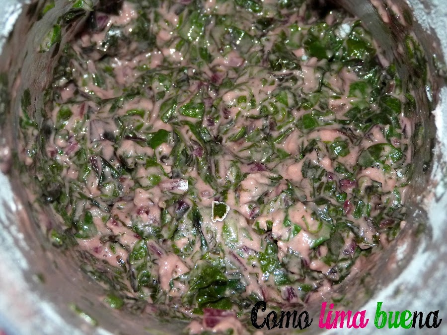 Ingredientes: hojas y pencas de remolacha (1 atado) + 2 huevos + 1 taza de harina leudante + sal y pimienta + 150 g. de muzzarella.