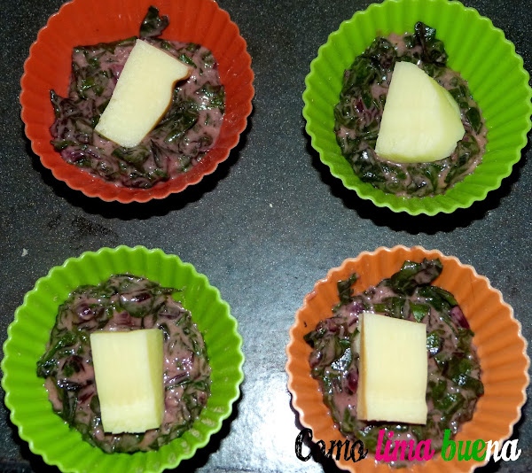 A continuación llenamos por la mitad los moldes de muffin. También podrías usar una budinera. Colocamos un cubito de muzzarella en el centro y cubrimos.