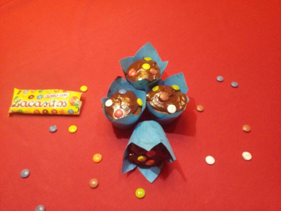 Horneamos unos 25 minutos. Para saberlo hay que pinchamos con un palillo y si salen sin migas, están. Dejamos templar y añadimos una cucharada de ganache y unos cuantos lacasitos. Y listo!