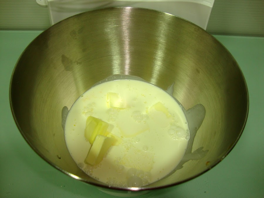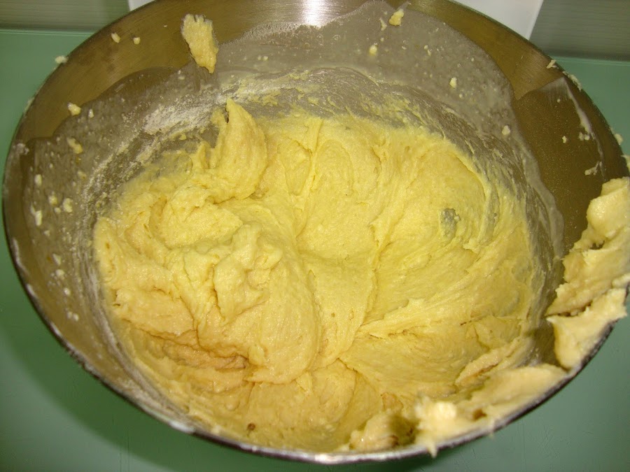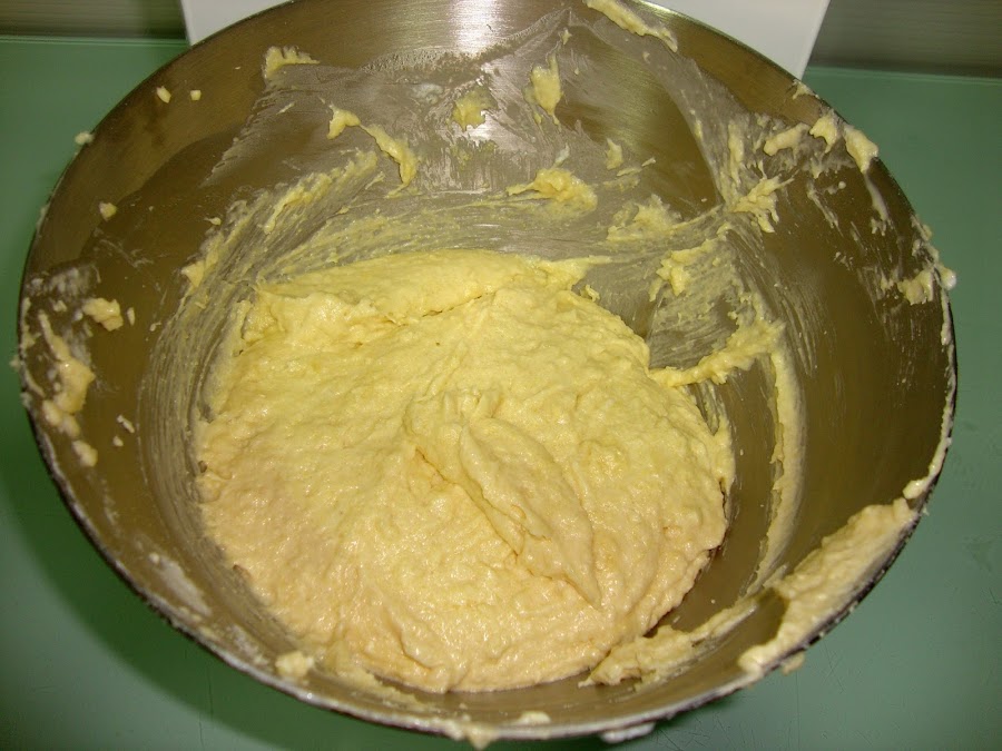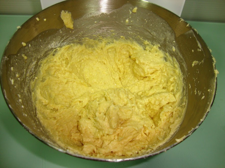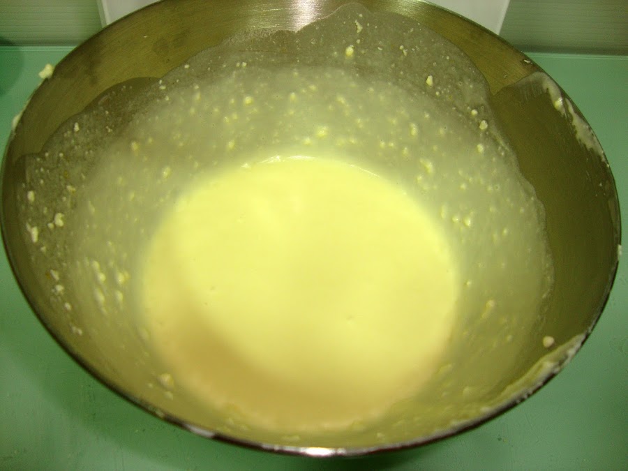 Batimos la mantequilla con el azúcar y le añadimos las yemas de huevo y la nata (crema de leche) y batimos hasta tener una masa cremosa.