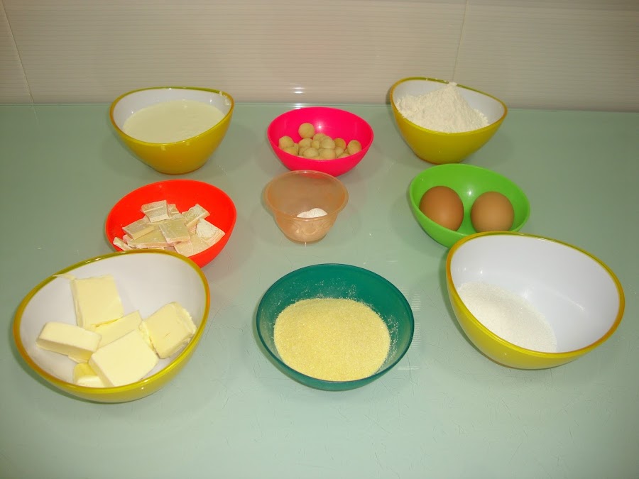 Le añadimos la harina de trigo y la sémola de trigo y cuando estén integrados le añadimos los trocitos de chocolate y de nueces.