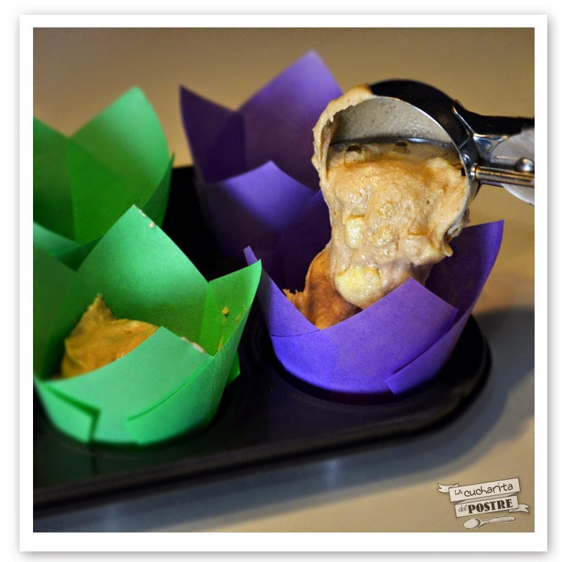 12. Pon tus papelitos para muffins (o las cápsulas que usas para tus cupcakes, si no los encuentras). Los cupcakes solo los llenamos hasta la mitad con una cuchara de helado, pero queremos que nuestros muffins crezcan y sean muy grandes, así que llénalos un poco más con la masa.
