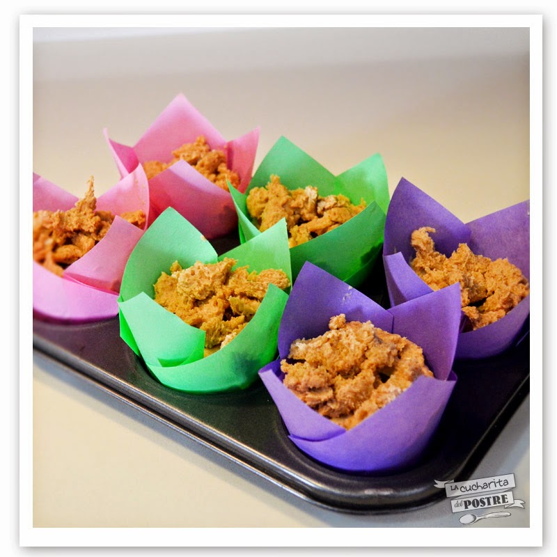 Tal cual están ahora ya los podrías hornear, pero vamos a ponerle por encima una cobertura llamada streusel, típica de Alemania, que va a ser la guinda del pastel y le va a dar un toque delicioso para que tus muffins sean irresistibles.