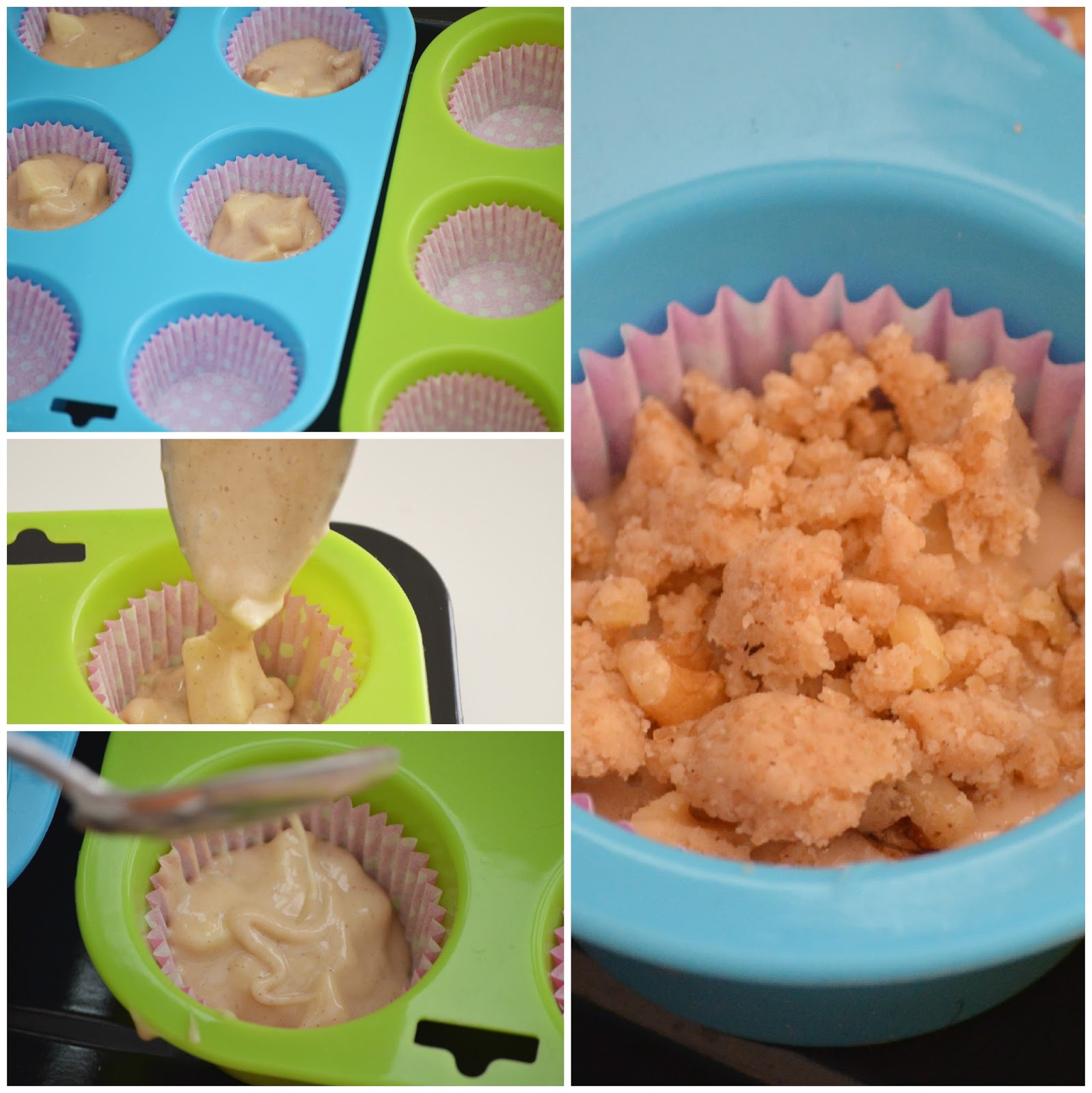 Pre-calentar el horno a 200º C. Preparar el molde con las cápsulas de papel. Para preparar la cobertura, ponemos la harina y la canela en un cuenco. Cortamos la mantequilla en trocitos y la incorporamos a la harina y la canela, mezclando con las yemas de los dedos hasta que la masa adquiera la consistencia de unas migas finas. Añadimos el azúcar y reservamos.