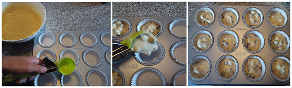 Finalmente se reparte la masa en moldes para cupcakes (yo uso una cuchara de helado porque de esta manera resulta más sencillo y el paso se convierte menos engorroso). Se introduce en el horno, 30 minutos mas o menos a 150ºC. Un truco muy conocido es pinchar con un palillo las muffins y cuando salga seco ya podemos sacarlas del horno. No hay que tener miedo de abrir la puerta del horno pues en este caso, al usar aceite en lugar de mantequilla, no se corre el riesgo de que las muffins se desinflen.