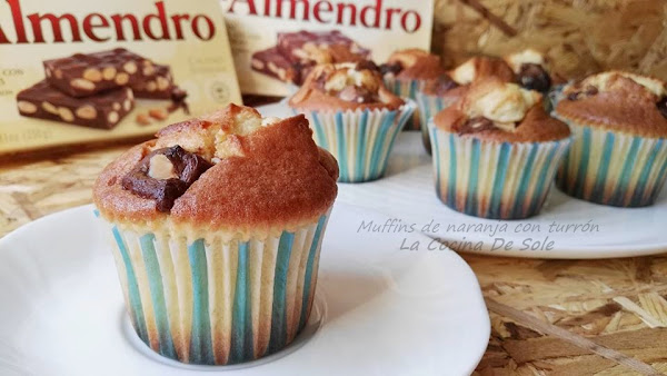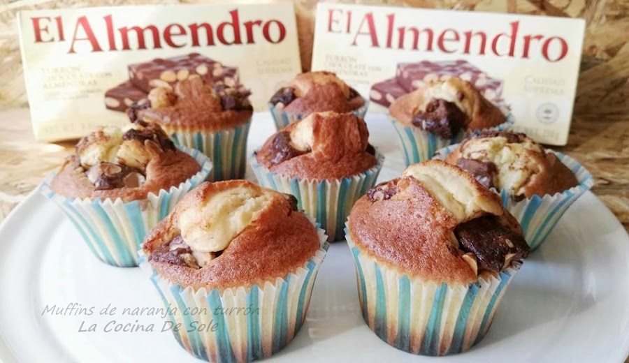 Son unos muffins de naranja, con turrón de chocolate y almendras de El Almendro, un turrón que está delicioso y queda perfecto para ésta receta.