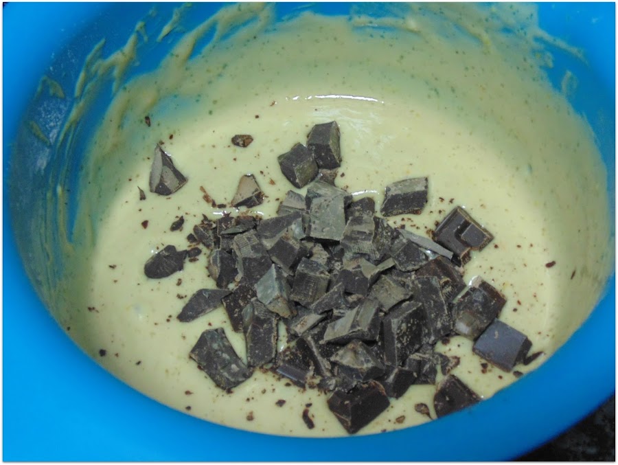 Una vez bien mezclado añadimos el chocolate troceado. ñammm adoro el aroma de la naranja y el chocolate!