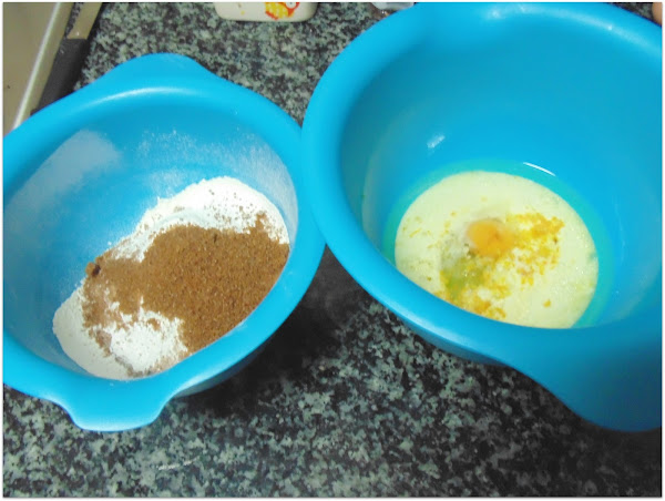 En otro cuenco, hacemos lo mismo con los líquidos: aceite, huevo, leche, vainilla, zumo de naranja y la ralladura.