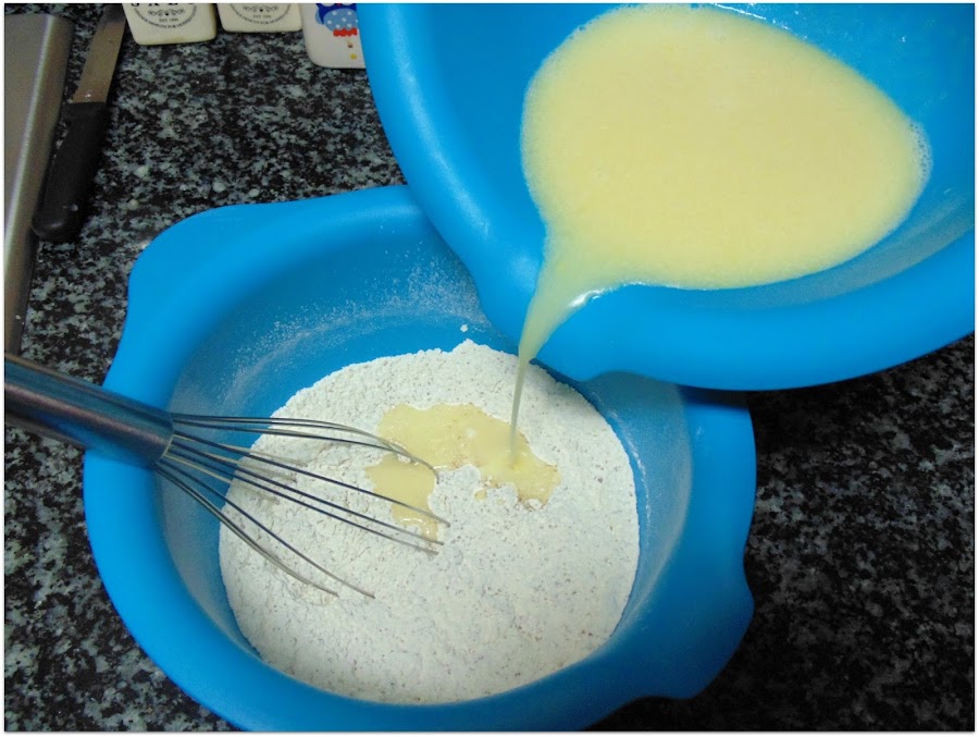 A continuación, batimos bien los líquidos y vamos agregando el contenido poco a poco, al recipiente del harina. Batimos hasta que quede homogéneo. Podéis ayudaros con una batidora de varillas.