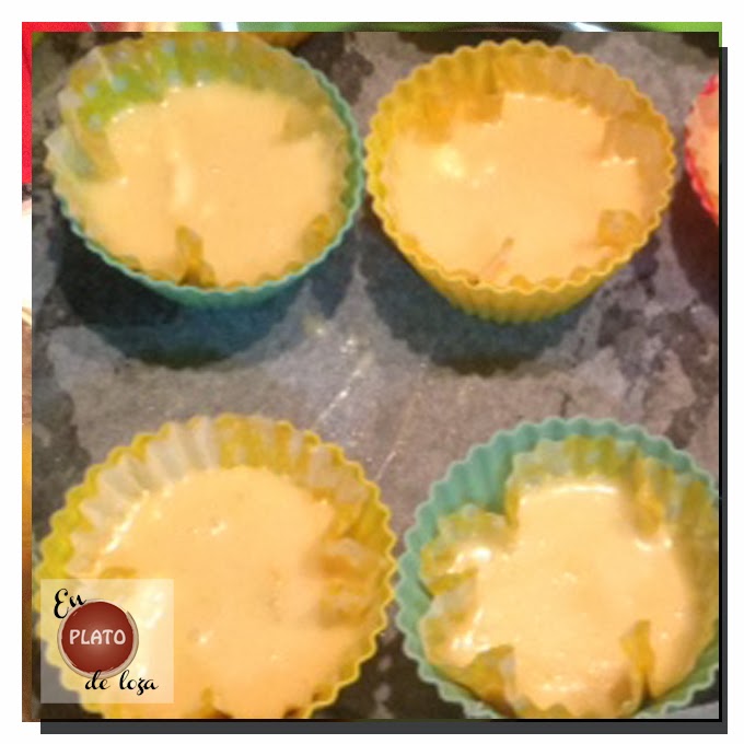 Pues a los moldes. Yo tengo moldes de silicona, muy cómodos para desmoldar, aunque también le puse un papel de los de "magdalenas". Si no se los ponemos, engrasamos los moldes con mantequilla. Hay que acordarse que los muffins subirán un poco (aunque tengo que reconocer que yo eché menos levadura de la que necesitaba y no me subieron mucho), así que no hay que llenar los moldes hasta arriba.