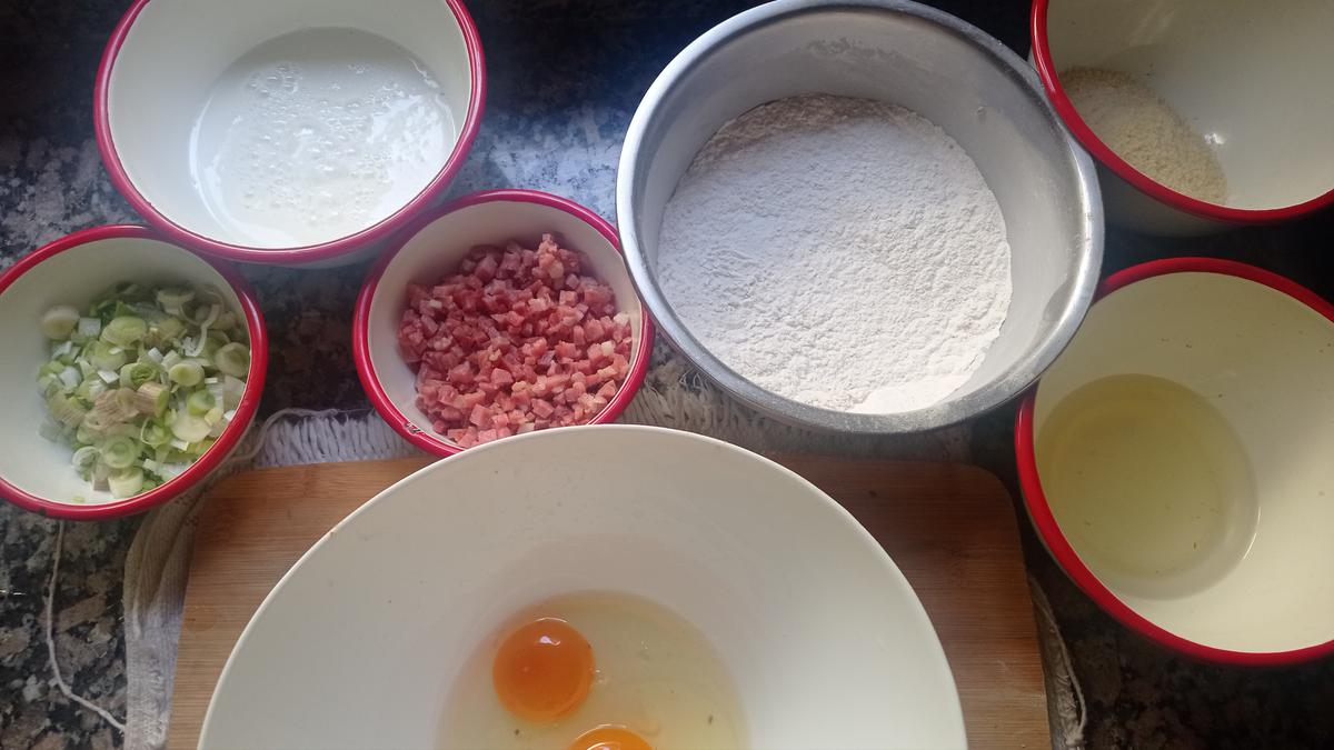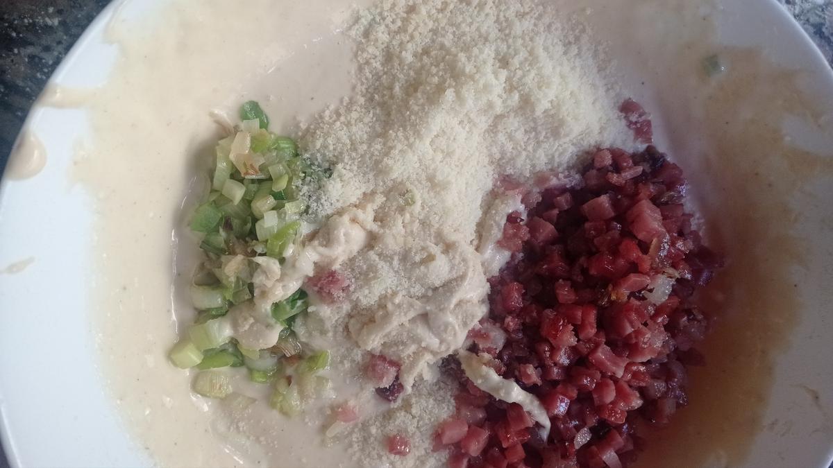 Batir los huevos, la leche, el aceite y agregar la harina mezclada con los demás condimentos, mezclar hasta que todo esté homogéneo y sin grumos.