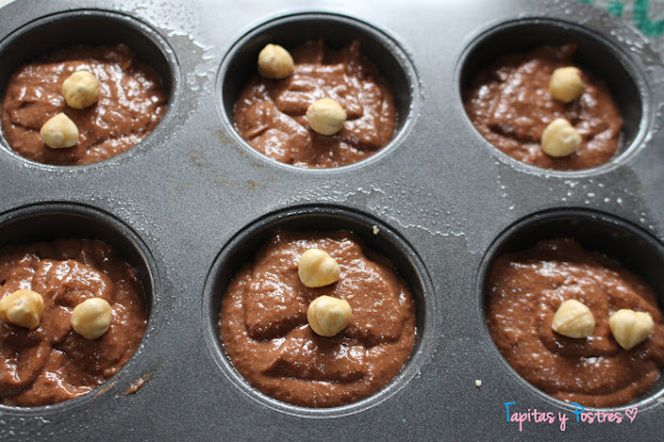 Vertemos la masa en moldes de muffins engrasados. Ponemos dos o tres avellanas dentro de la masa. Y Horneamos a 180º, con calor arriba y abajo unos 15 minutos. Haced la prueba del palillo antes de sacarlos. Los dejamos que se templen y los desmoldamos sobre una rejilla.