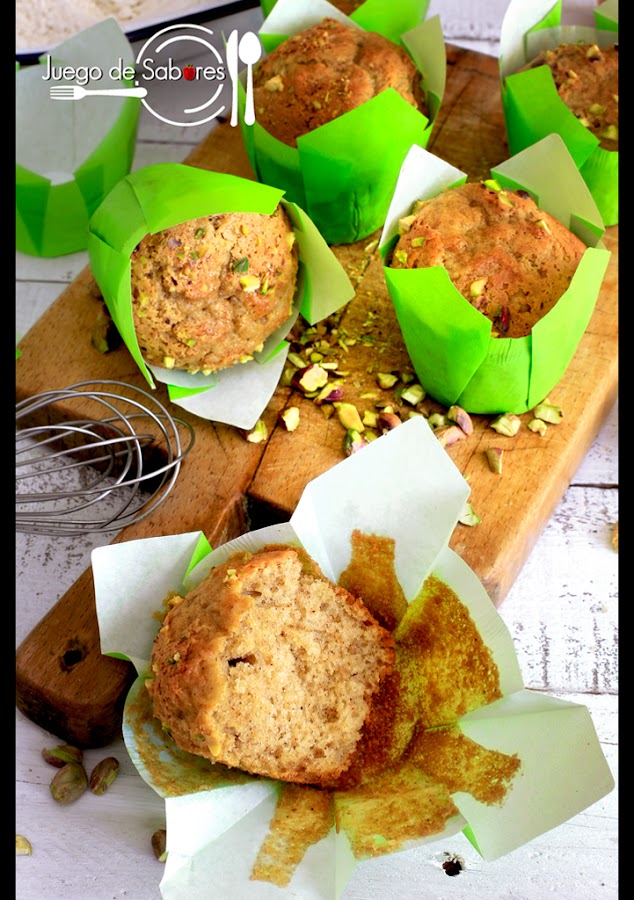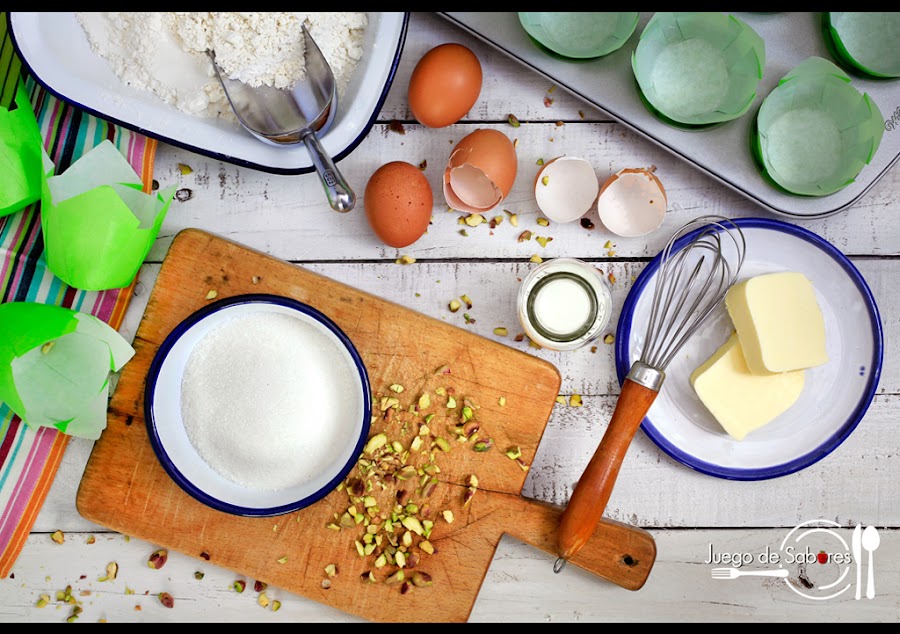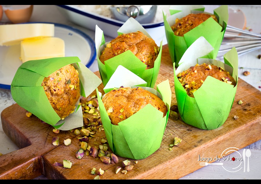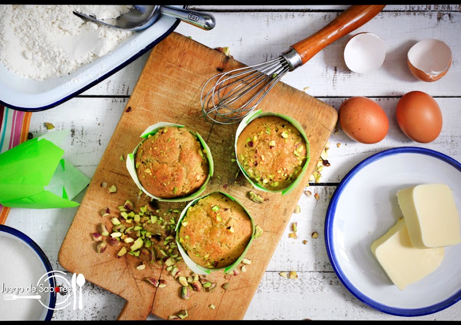 Nuestra madre diría que este postre son unas magdalenas y se quedaría tan ancha. Pero resulta que los tiempos cambian, el vocabulario evoluciona, e incluso en política lo que ayer era blanco hoy es negro y mañana puede que sea gris. Éste sería el caso de estos muffins de pistacho. En casa lo llamaríamos una magdalena evolucionada que ha tenido la suerte de hacer una beca Erasmus en Inglaterra y que ahora vuelve revalorizada a nuestro país. La firma francesa Jean Hervé, que nos obsequió en su día con una crema de sésamo negro que utilizamos para hacer unos bizcochos, nos ha mandado una pasta de pistacho con la que hemos hecho estos muffins. El pistacho no es uno de los frutos secos más usados en nuestra cocina. De hecho, la parte comestible ni tan siquiera es un fruto si no una semilla. El pistacho es un ingrediente esencial en la cocina árabe. Originario de Oriente Medio, Irán es su máximo productor, seguido de Siria -¡pobre Siria!- y Turquía.