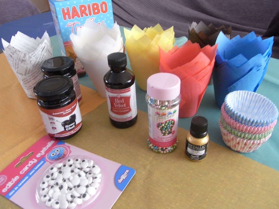 También estaba esperando a que viniese mi amiga Ana de Madrid que me traía cápsulas para muffins de esas chulas que me encantan pero claro no trajo sólo las cápsulas, vino con una selección alucinante de cosas para hacer repostería decorativa, hay hasta ojos de azúcar! ja, ja, ja.
