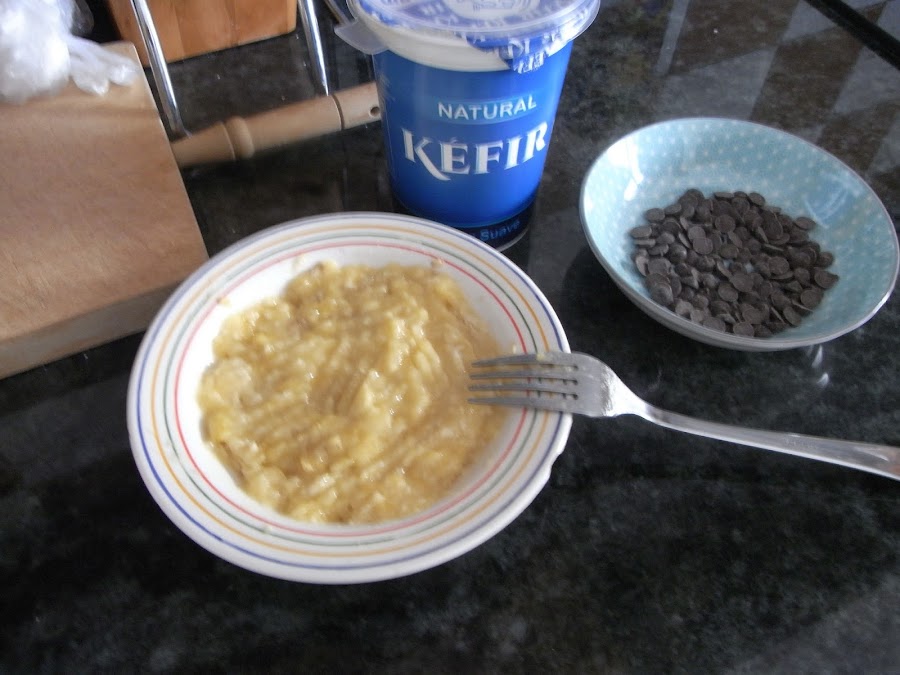 Añadir los ingredientes secos tamizados y remover con una espátula con cuidado hasta que no queden grumos. Machacar los plátanos con un tenedor y mezclarlos con los otros ingredientes y por último añadir el kéfir e incorporarlo.