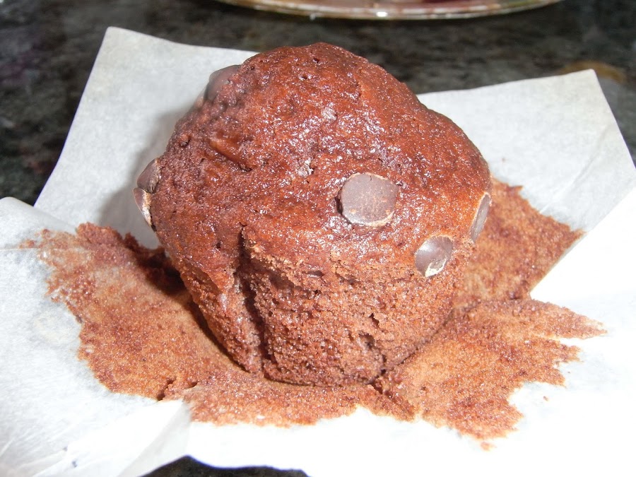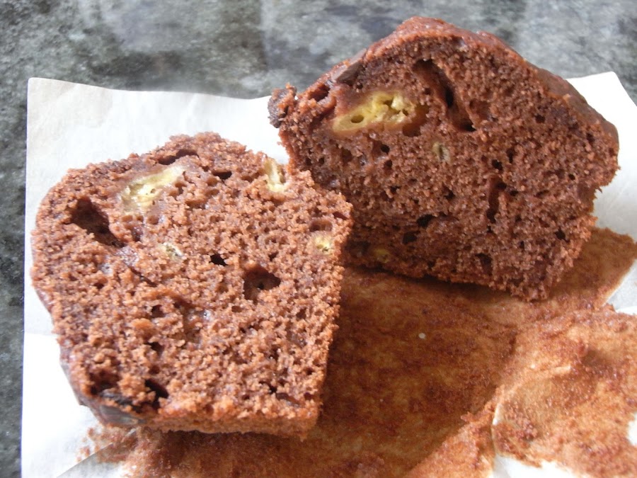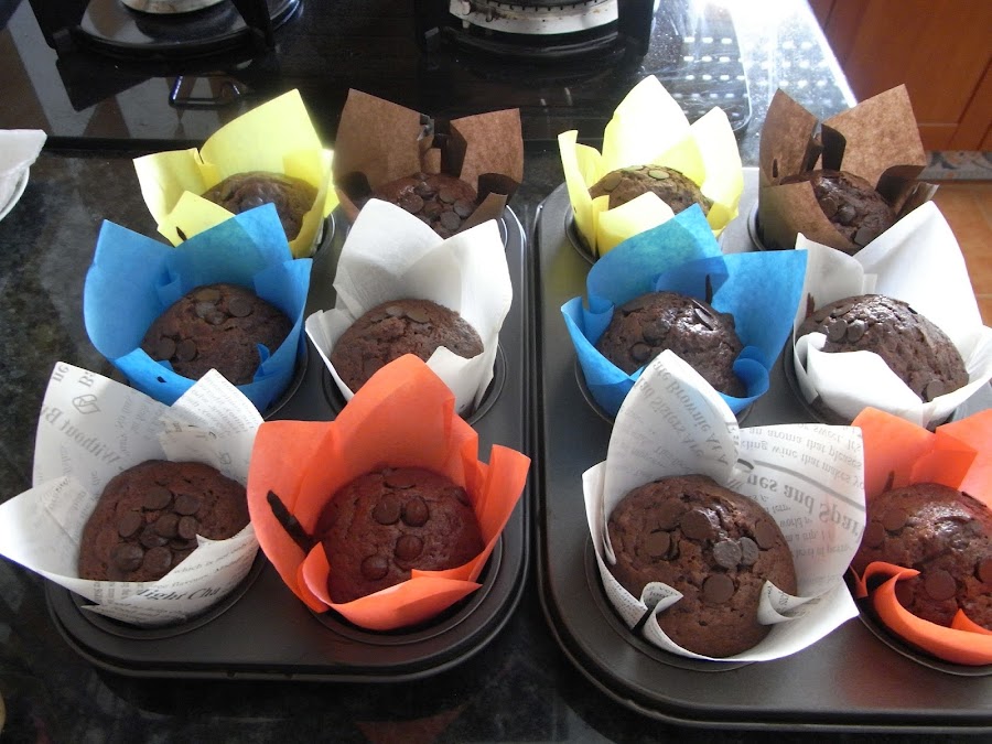 Rellenar los moldes con la crema obtenida más o menos hasta la mitad o un poco más y poner unas pepitas de chocolate por encima. Meter en el horno a 180 grados 22-25 minutos.