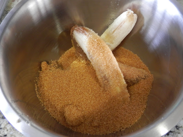 Corta los plátanos a la mitad y cubre con el azúcar moreno.